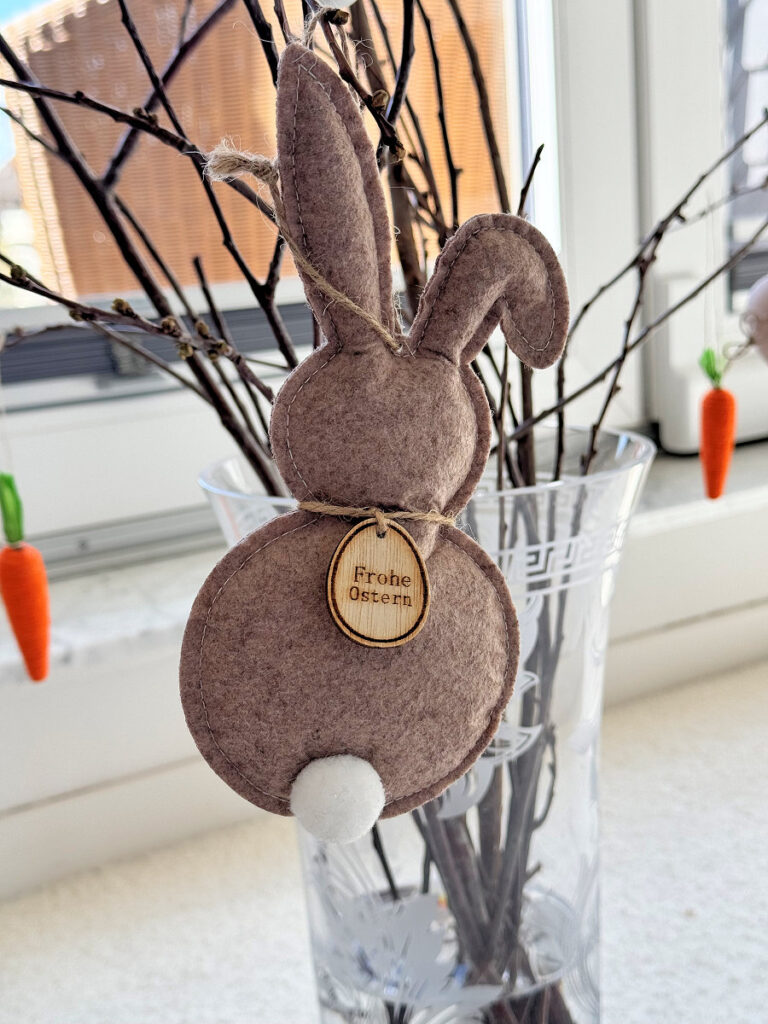 Gestern habe ich mit der Enkelin einen Osterstrauß mit Holzeiern und -Häschen geschmückt. Nun warten wir auf das Aufblühen der darin stehenden Kirschzweige…
