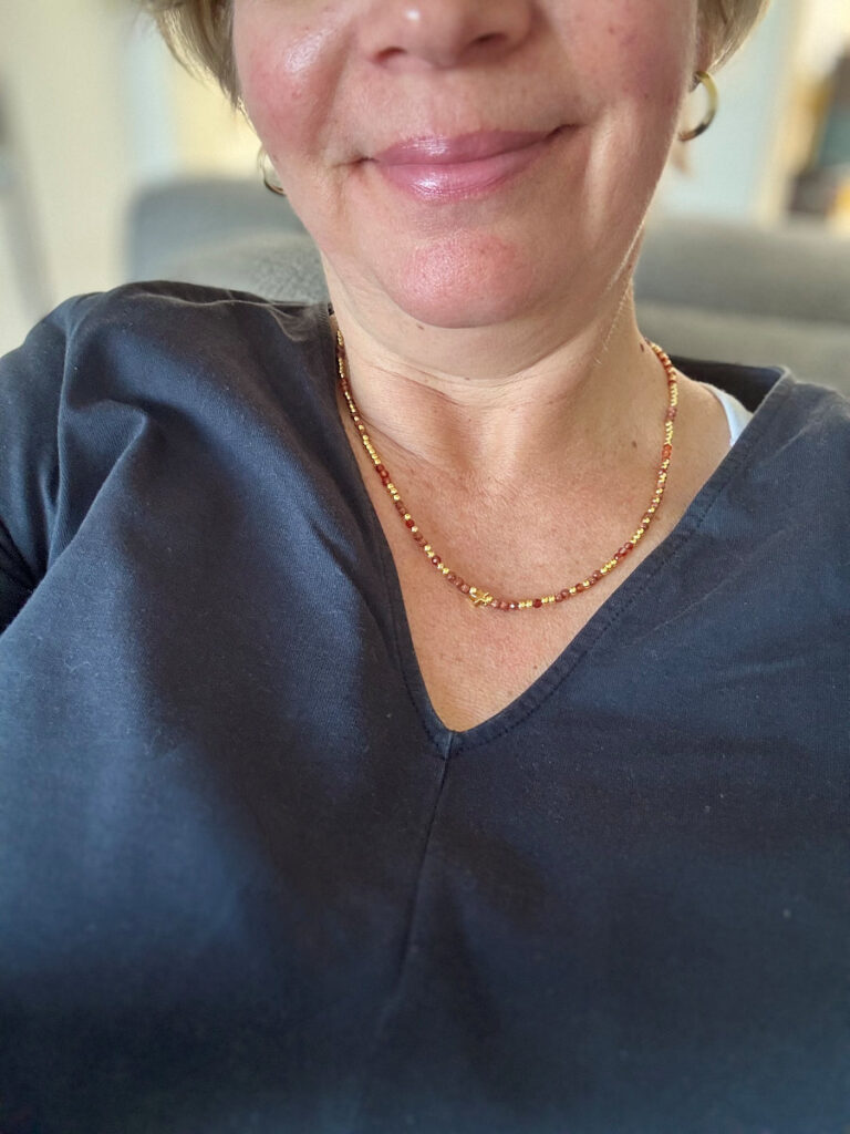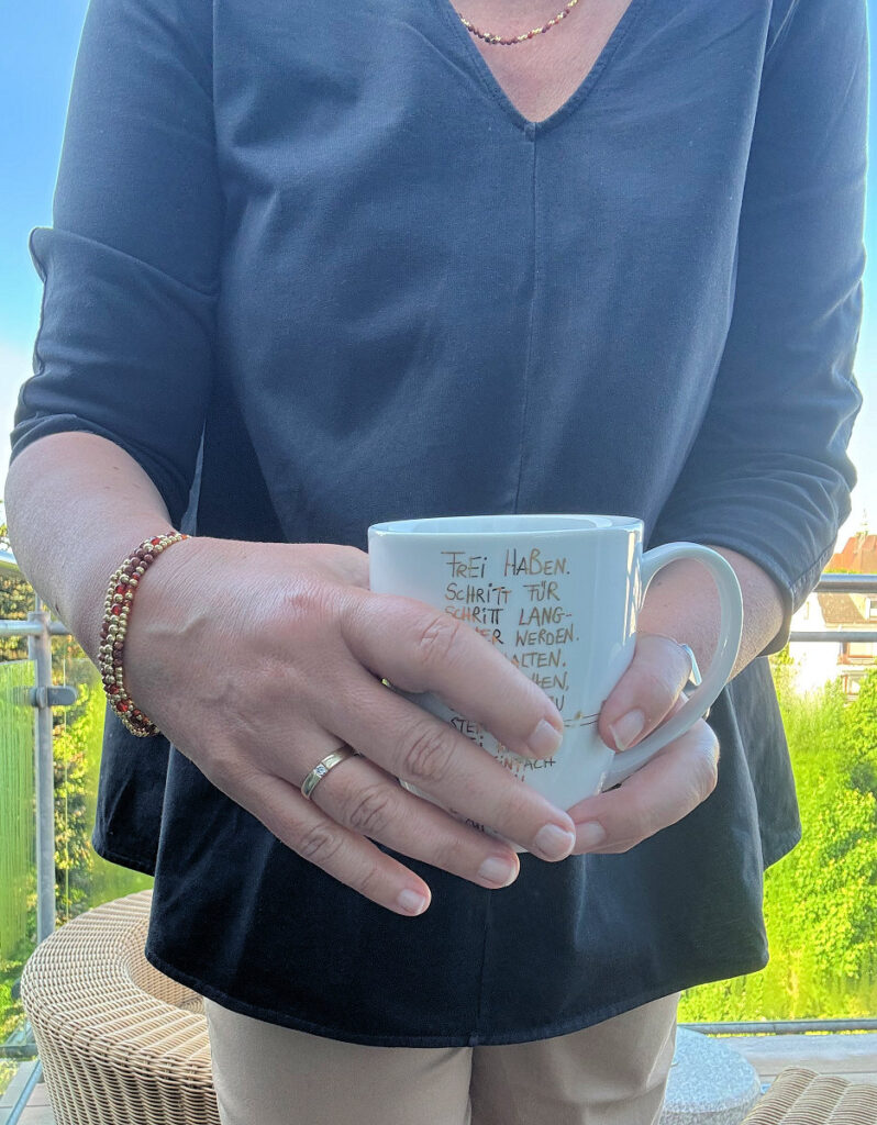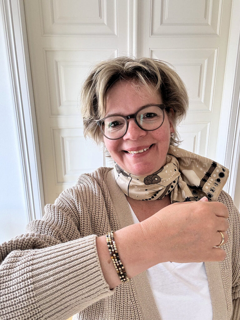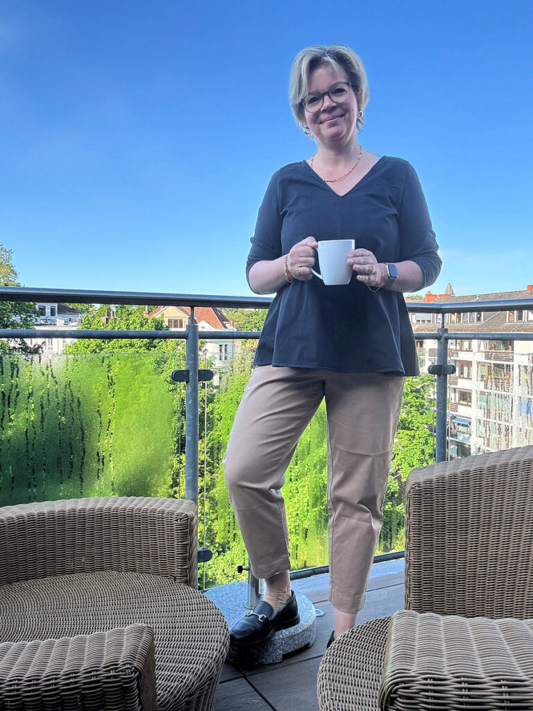 Ich habe ein Webinar und zwei Handwerkertermine, fühle mich also ans Haus gebunden. Dazu entscheide ich mich für meine camelfarbene Culotte und ein dunkelblaues Blusenshirt, das ich vor ewigen Zeiten in Wien erstanden habe. Ich trage es selten und ich weiß heute auch wieder, warum. Der dreiviertel Arm hat bei mir eine ungünstige Länge, denn er zieht ungut in die Ellenbogenbeuge. Dennoch mag ich es sehr.