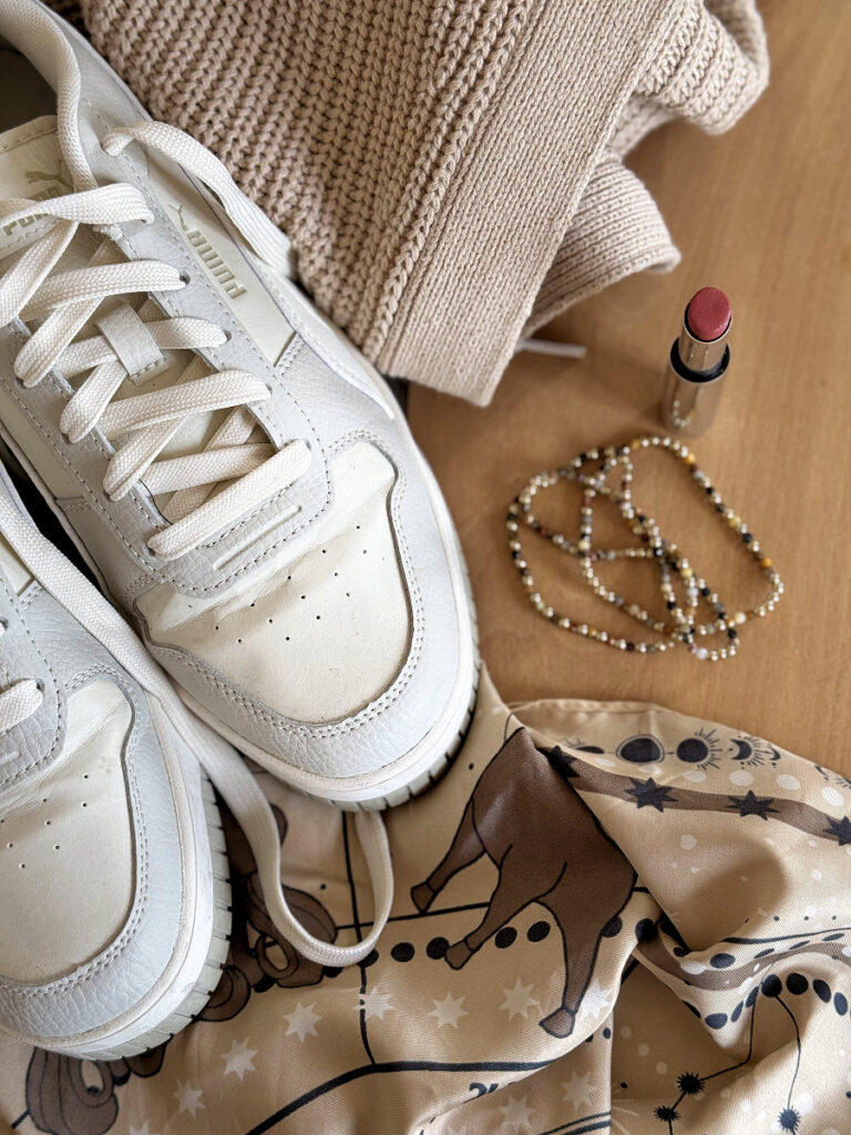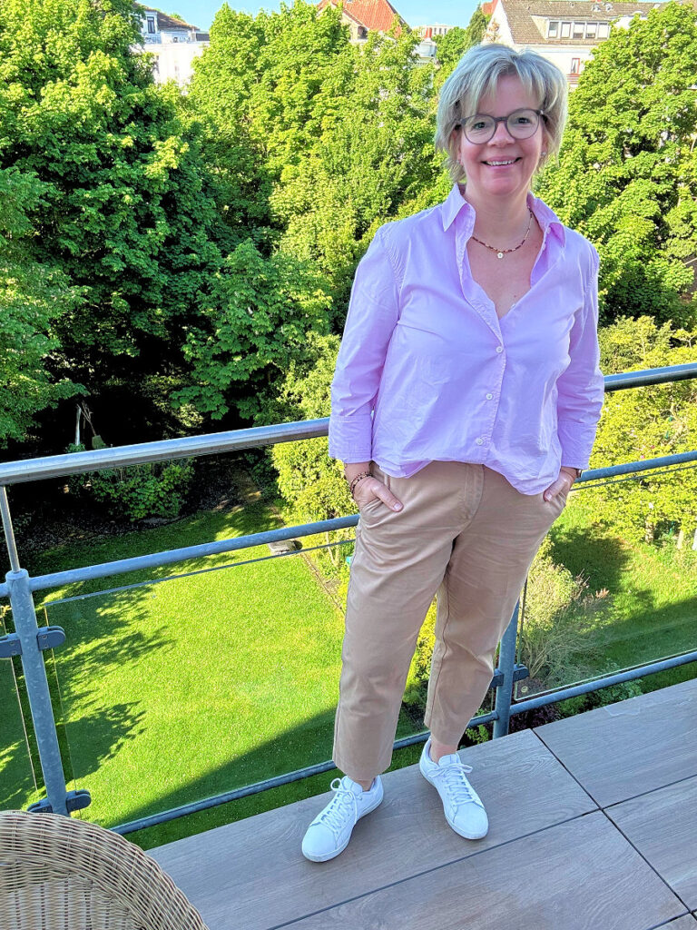 Wieder zu früh wach, aber hey, es ist still. Heute Abend gibt es noch ein Essen und da gibt es? Ich bin gespannt, ob ihr darauf kommt. Das Outfit ist pink-camel, diese Kombination macht mich immer glücklich. Dazu die Armbänder und eine Kette von Petra und die weißen leichten Sneaker.