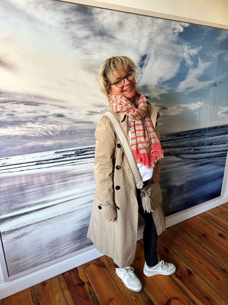 Bevor der von mir für mich gesetzte Zeitraum für Leinenblusen zu Ende geht, trage ich heute auf dem Weg zurück ins andere Zuhause meine enge Jeans und ein beiges Leinenhemd. Dazu gibt es die beigen Sneaker mit dem wilden Design. Und gegen die Frische den Trenchcoat.