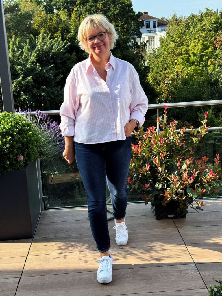 Vom gestrigen Tag soll von den Temperaturen nicht allzu viel übrig bleiben, also fällt die Wahl zwar auf die Jeans, aber die Bluse wird mit rosa Streifen und langärmelig angepasst. Dazu gibt es die Sneaker mit dem goldenen Krokodil. So laufe ich nicht Gefahr, unterwegs zu frösteln.