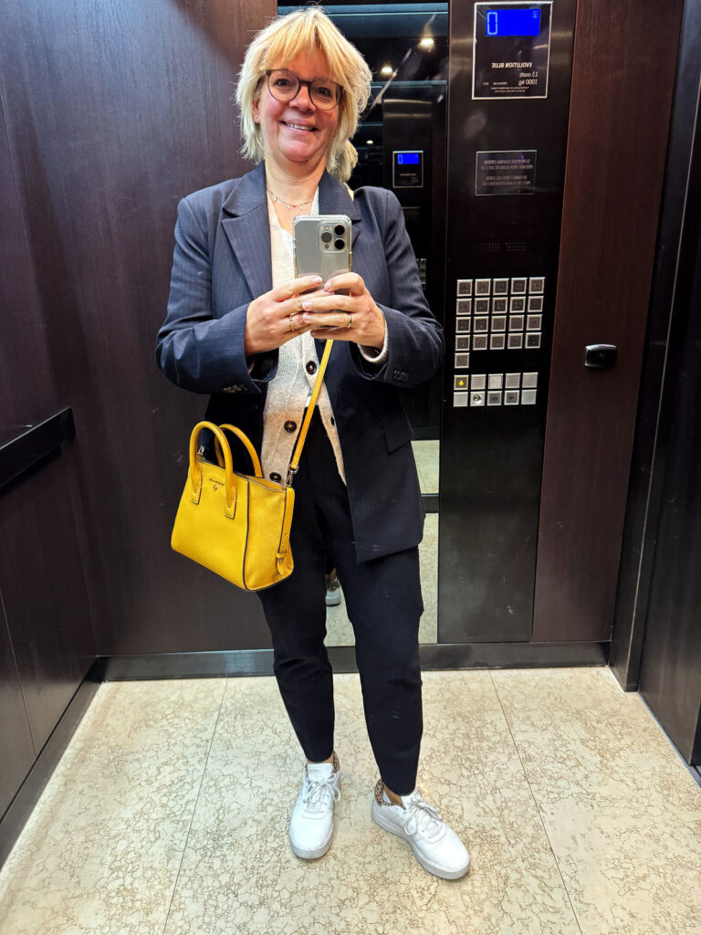 Heute habe ich mich tatsächlich noch einmal umgezogen, weil heute Abend ein etwas formellerer Termin ansteht. Ich trug also tagsüber meine blau gestreifte Bluse mit einer Jeans und dem Nadelstreifenblazer mit den Sneakern.