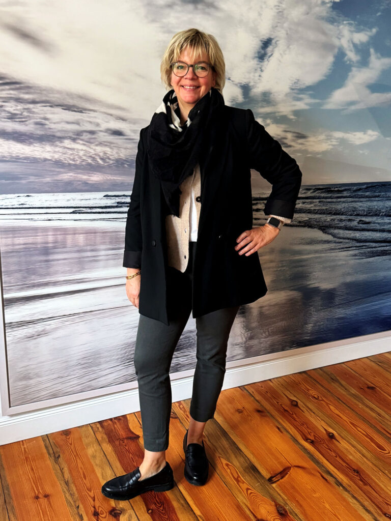 Mir gefallen alle Looks mit Hose und Blazer sehr gut – ich liebe diese Kombination. Aber der Look mit dem dunkelblauen Kleid mit dem Blazer und Loafers ist klasse!