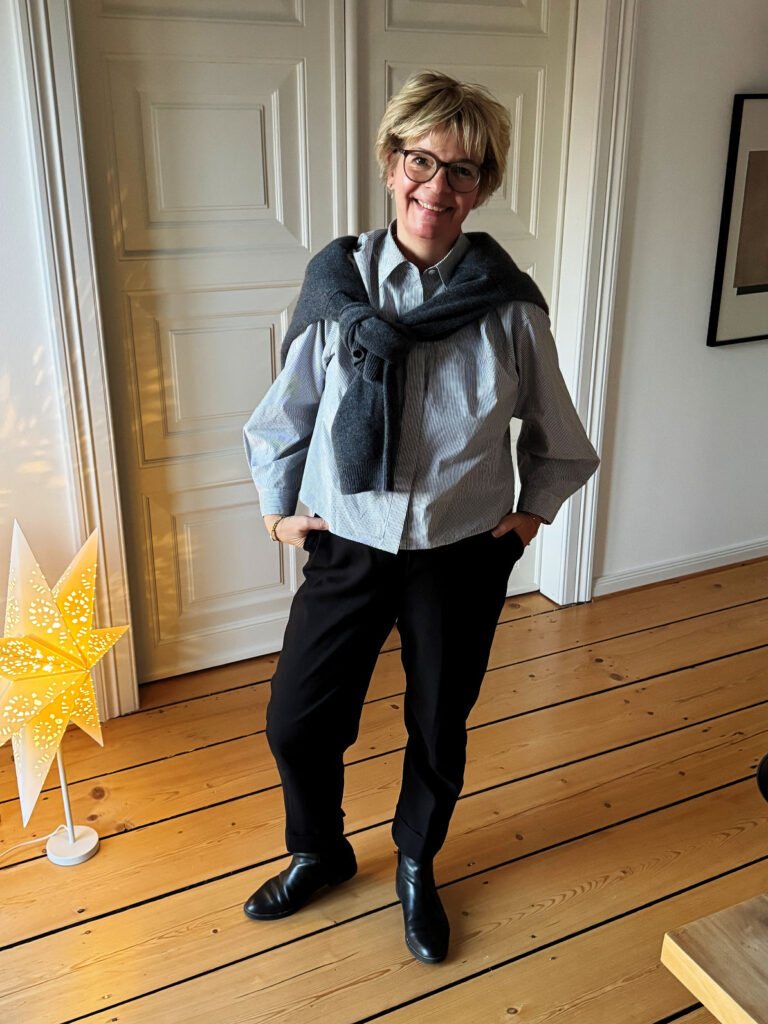 Der Mount Bügelwäsche schaut mich grimmig an und mittags wartet mein Friseur auf mich. Und ähnlich wie das Wetter kann ich auch Grau. Mit einem Hauch Braun. Die Strickjacke ist eine Erinnerung an London und ich werde sie nicht mehr ausziehen. Stand jetzt. Dazu kombiniere ich die Streifenbluse und die Mom Jeans vom Samstag.