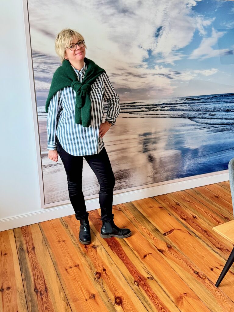 Das Outfit heute ist so simple wie grün, denn es ist mal wieder frisch. Und so kommen die schwarze Skinny Jeans mit der gestreiften Bluse und dem kuscheligen Pulli in dunkelgrün noch einmal zum Einsatz, bevor für ihn der Sommerschlaf beginnen wird. Dazu gibt es Stiefeletten, denn auch der Freitag (Rückfahrt) soll ja kalt werden.