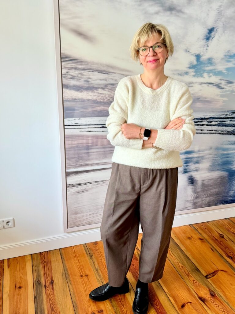 Ein morgendlicher Marktbesuch, ein leider früher Vogel, ein Zoom-Meeting, der Blog und abends Tapas beim Griechen, so wird der Tag aussehen. Das Wetter ist grau, soll nasser werden und ich bin im Übergang begriffen: Also gibt es die weite Hose in Taupe heute mit dem Cardigan, den ich letzte Woche hier hängengelassen habe. Und um mir selber einmal eine Alternative zur Bluse zu bereiten, gibt es ein weißes Langarmshirt dazu.