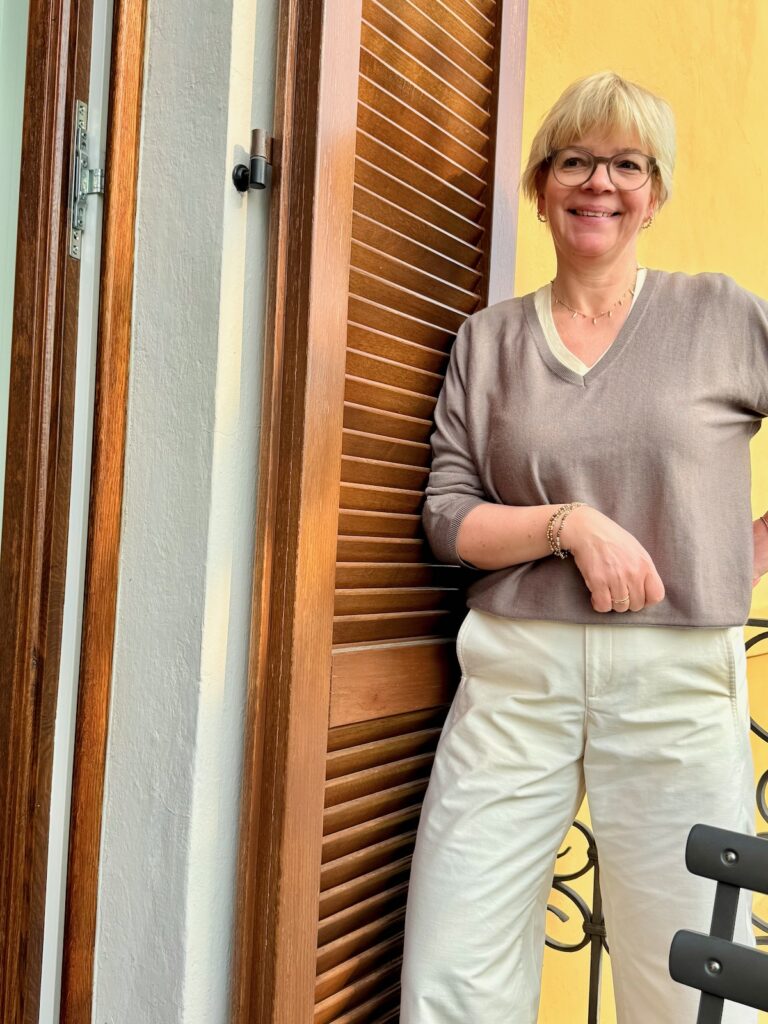 Heute geht es schon wieder nach Hause und so heißt es, ein letztes Mal Dolce Vita atmen, die Sonne genießen und dann los. Ich habe heute Nacht ein großes Gewitter erlebt, aber danach war wieder alles fein. Das Reiseoutfit heute ist wie ein Geburtstagsoutfit: Ich trage meine weite (Knitter) Hose, ein weißes T-Shirt und die kuschelige Strickjacke zusammen mit den weißen Sneakern, die ab morgen eine Pause bekommen. Und weil es alles irgendwie kurz war, gab es nur ein schnelles Spiegel-Selfie zuhause.