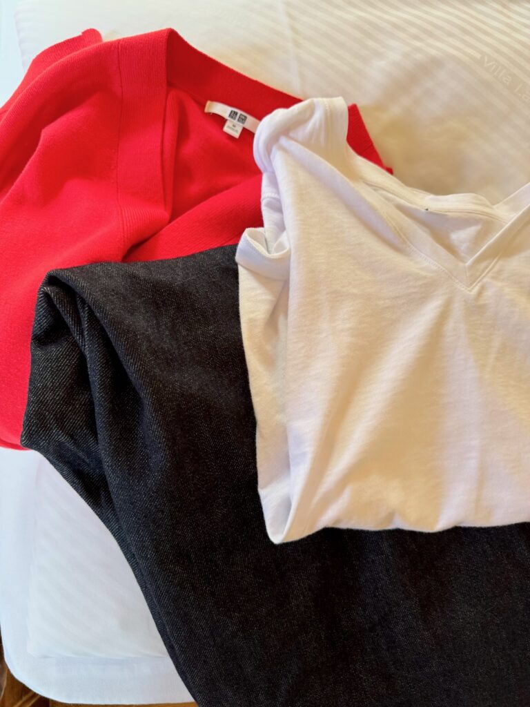 Mein Reiseoutfit beinhaltet ein weiteres Farbexperiment, denn ich habe es gewagt: Ich habe mir eine rote Strickjacke gekauft. Dazu trage ich wieder die weite Jeans, ein weißes T-Shirt und die Sneaker. Im Frühling losgereist und im Sommer angekommen. Herrlich.
