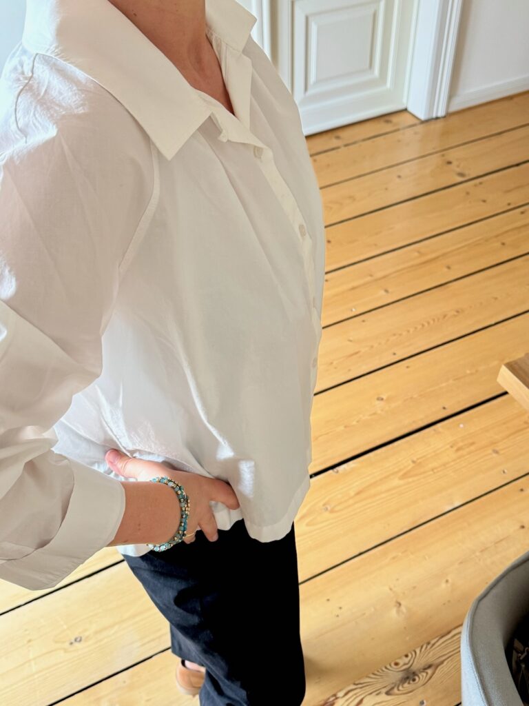 Kalt ist ja noch einmal kälter, wenn es vorher warm war. Heute steht ein Besuch bei unseren Freunden an und ich habe einen kleinen ‚Tick‘: Wenn das Wetter zuhause und auf Reisen ähnlich sind, dann packe ich Sachen aus dem Koffer nicht zurück in den Schrank, sondern trage sie direkt. Darum kommt heute die weiße Bluse zum Einsatz. Da es jedoch regnet, verwerfe ich meinen Traum einer beigen Hose und ziehe meine Nadelstreifenhose an. Und ja, ich trage die hellen Loafer dazu.