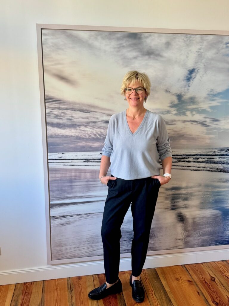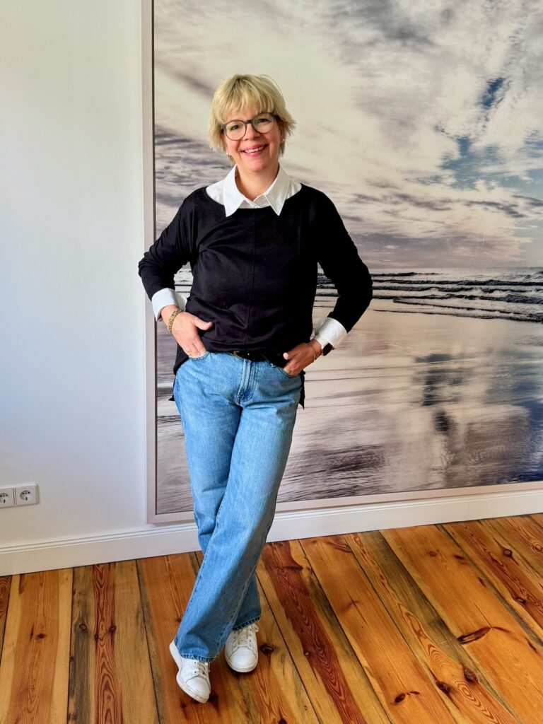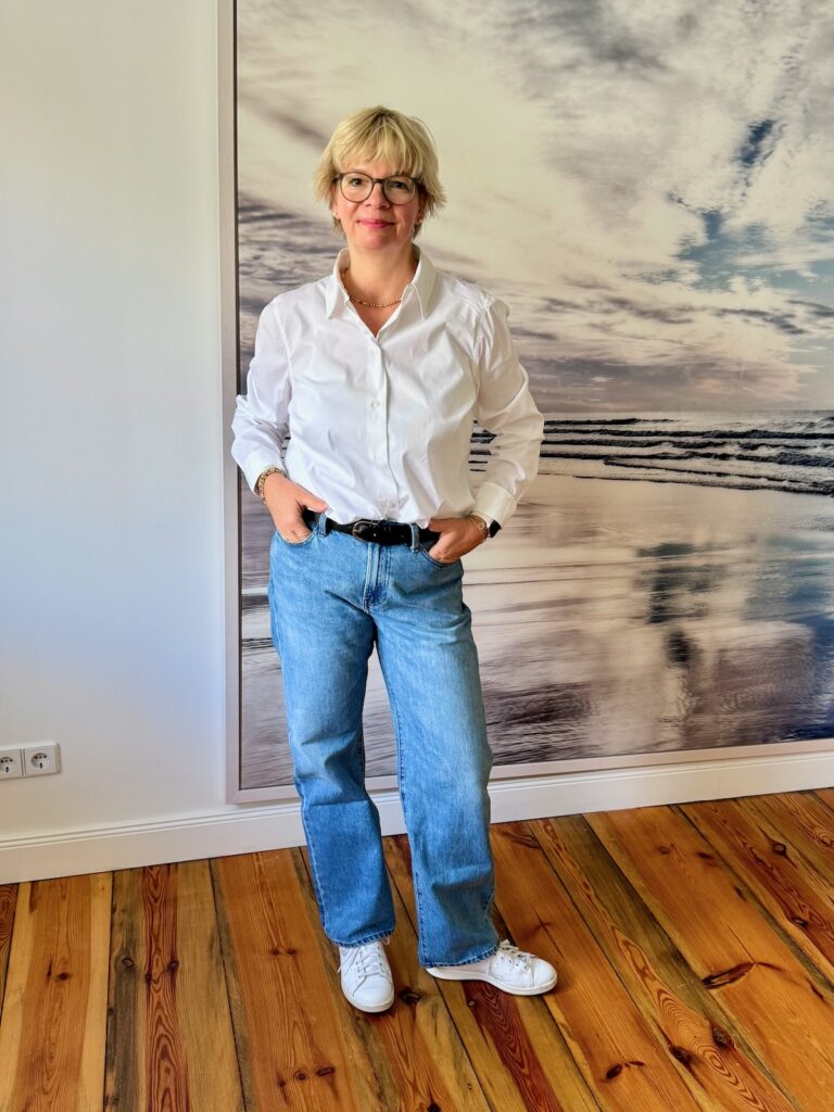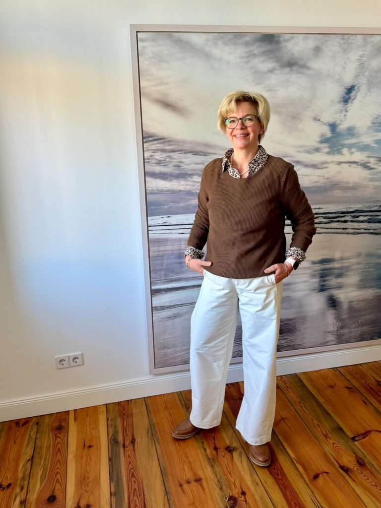 Der gestaltet sich mit einer Jeans, die die einen straight und die anderen (ich) weit nennen, einer weißen Bluse, dem obligatorischen Pullover zum Wärmen der Schultern und mich und für das Outdoor-Geschehen mit meinen Sneakern und einem beigen Blazer.