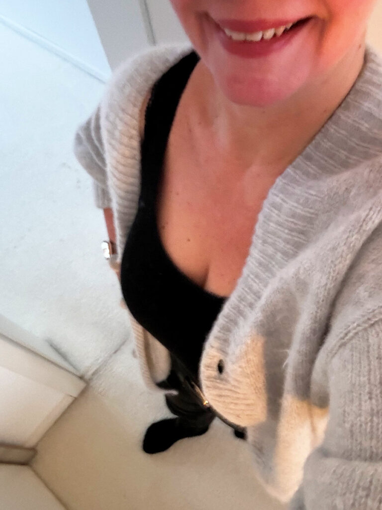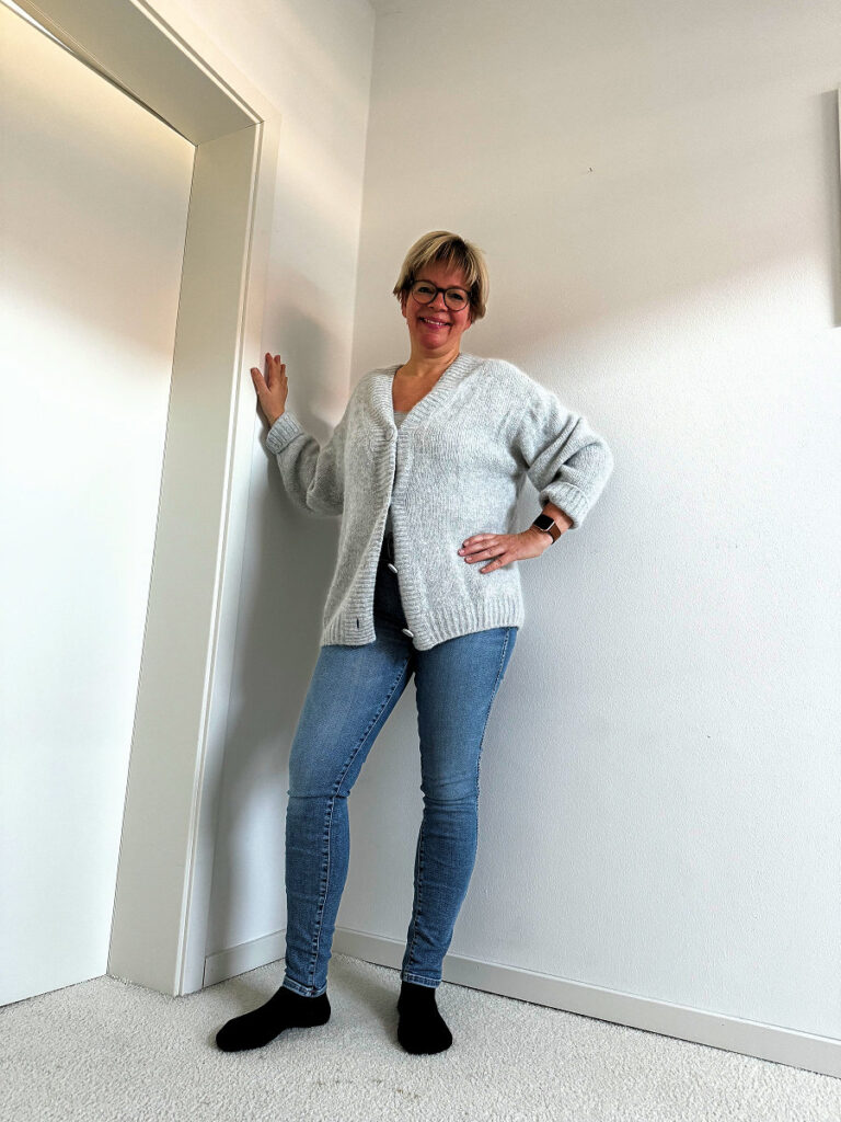 Der hellgrau Kuschelcardigan fällt schön lässig. Der Look mit der hellblauen Jeans gefällt mir sehr. Ein Top ist das beim Look mit Schwarz? Hatte mich bei bei de letzten Beitrag schon etwas über das neckische „die Unterwäsche schaut raus und ich zeige Busenansatz-Foto“ am Ende gewundert. Bestimmt sieht das real super zusammen aus. Auf den Bildern ist mir die Textur des Tops zu leicht/unterwäschig für den volumigen Cardigan. Oder ist genau das gewollt?