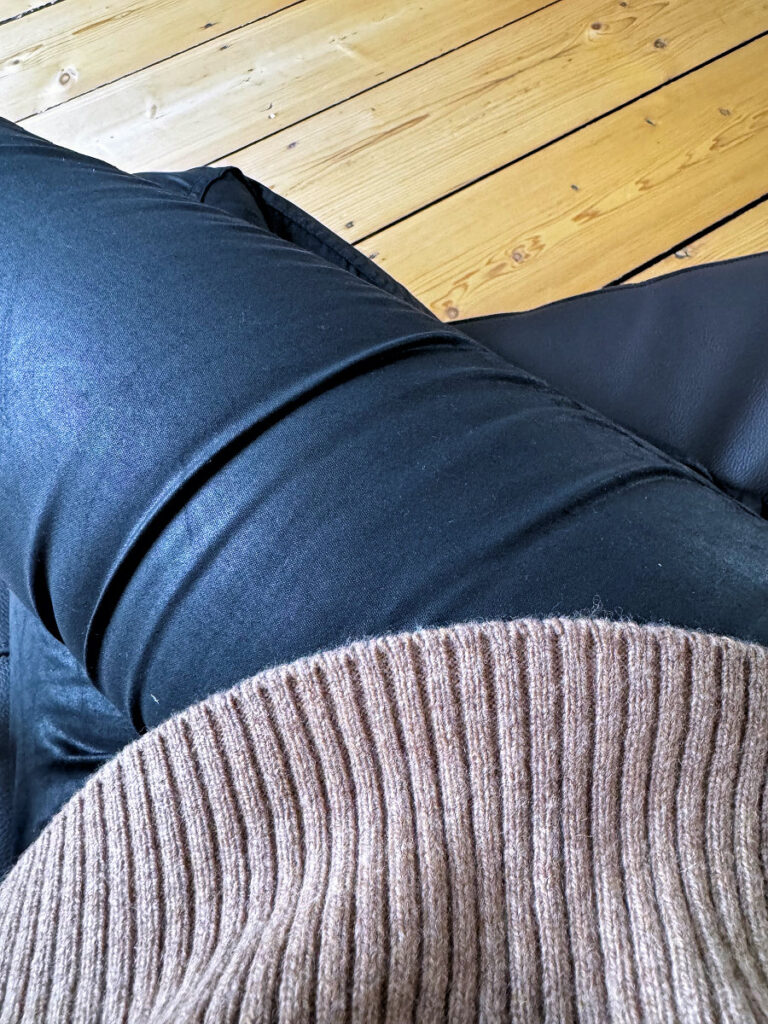 Ich schlüpfte somit in meinen kuscheligen Rolli** und meine beschichtete Hose*, die ein wenig wie eine Lederhose anmutet. Draußen trug ich dazu die Stiefeletten** und die mobile Bettdecke.