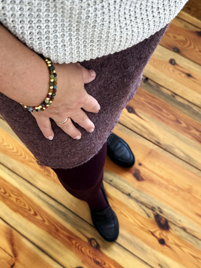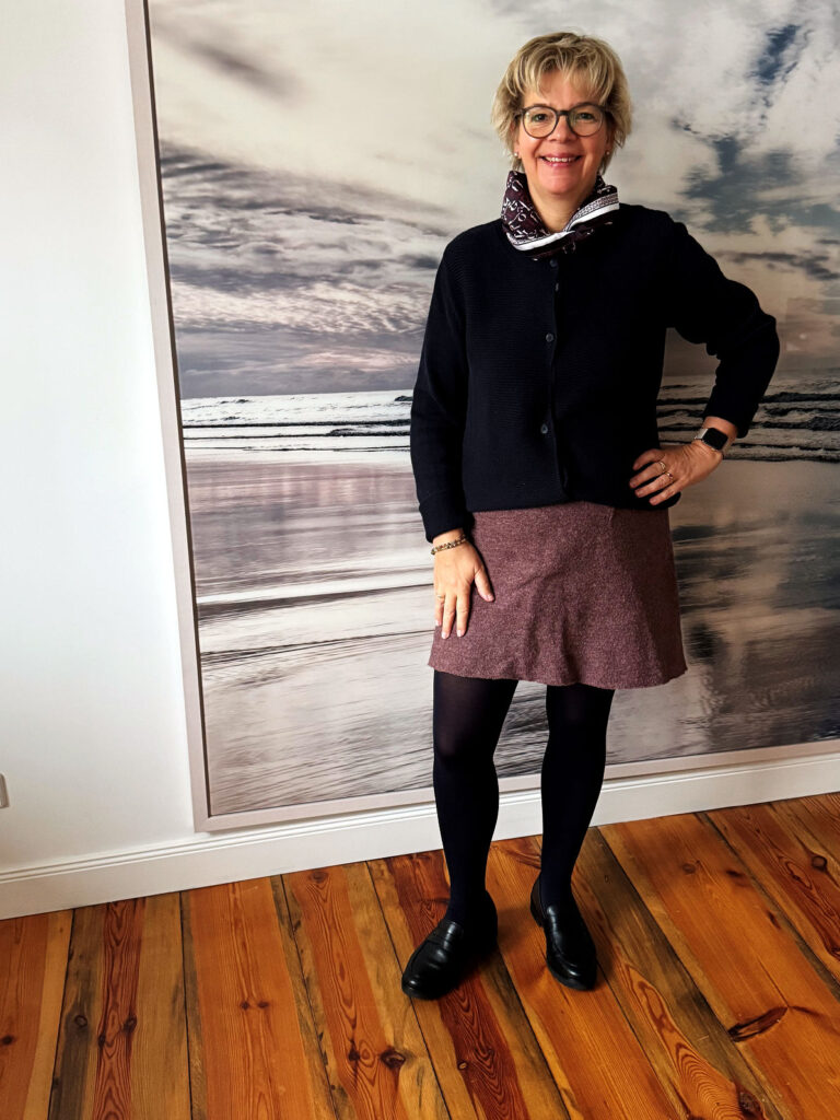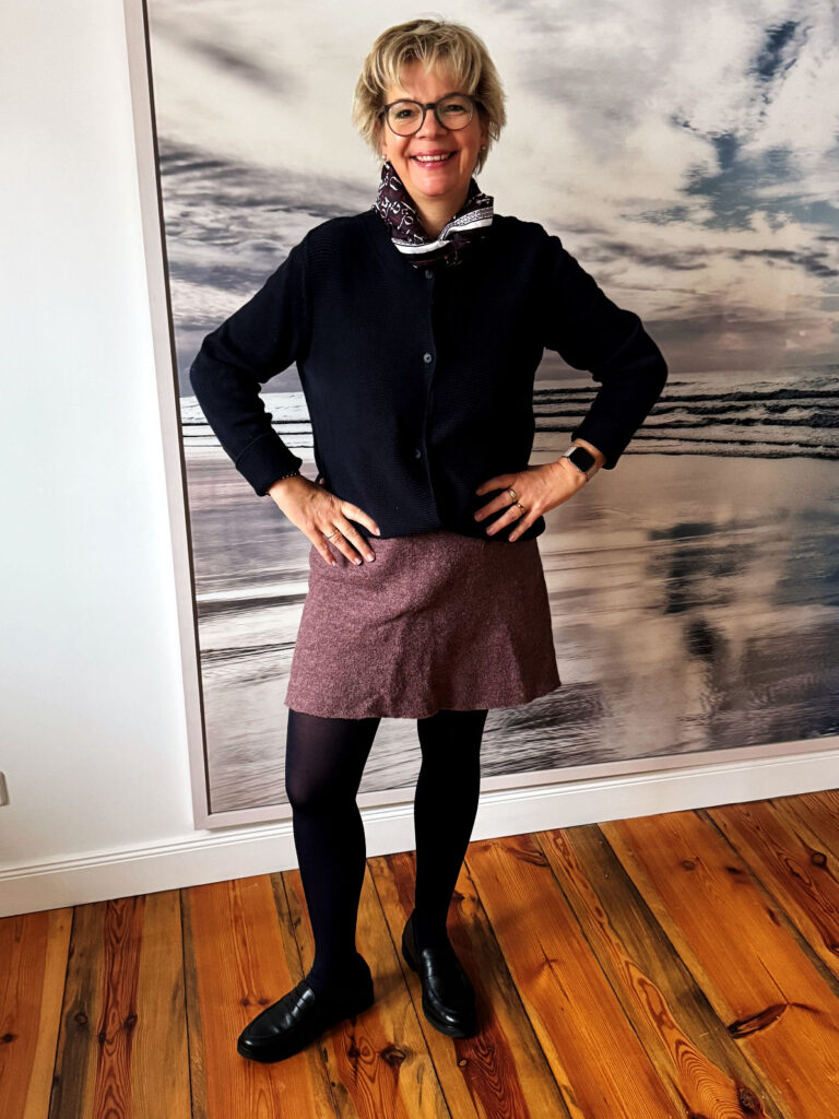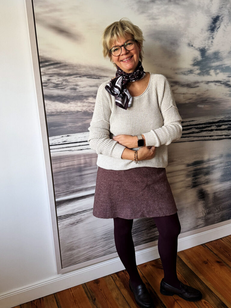 Da ich heute auch noch ein paar Besorgungen zu tätigen habe, entscheide ich mich für den Rock in Bordeaux und den Pulli von gestern. Das Halstuch ist Accessoire, denn es ist ein leuchtender Tag bei gräulichem Himmel. Draußen kommen der Mantel und die braunen Loafer hinzu. Petras Armbänder sind wie immer am Start.