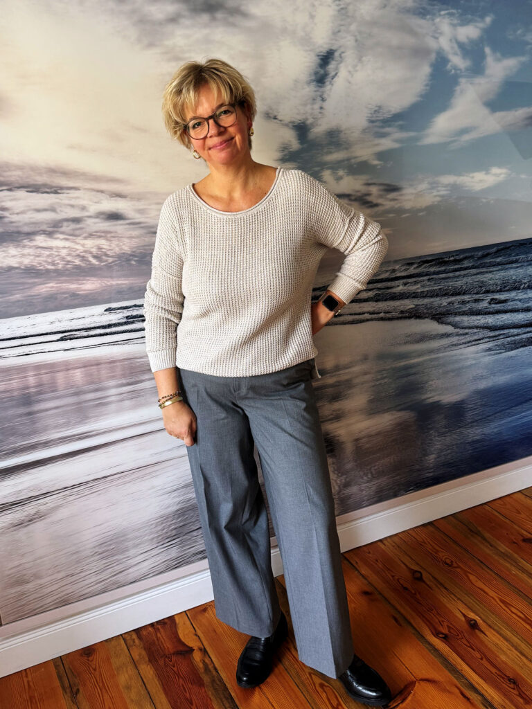 Ich trage eine weite graue Hose, einen beigen, lässigen Strukturpullover und draußen Loafer, den Mantel und einen grauen Schal. Und ich empfehle noch einmal wärmstens im besten Wortsinn meine Strümpfe, es gibt gerade ein tolles Angebot (Werbung aus dem warmen Herzen)