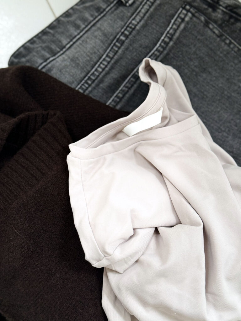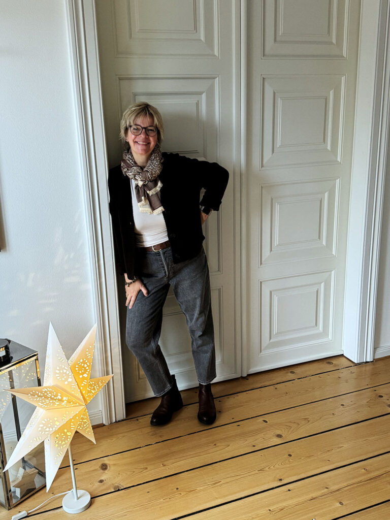 So geschehen mit der kuscheligen braunen Strickjacke. Mir war nach Jeans und ich habe die graue Mom-Jeans dazu gewählt, ich mag die Kombination mit braun.