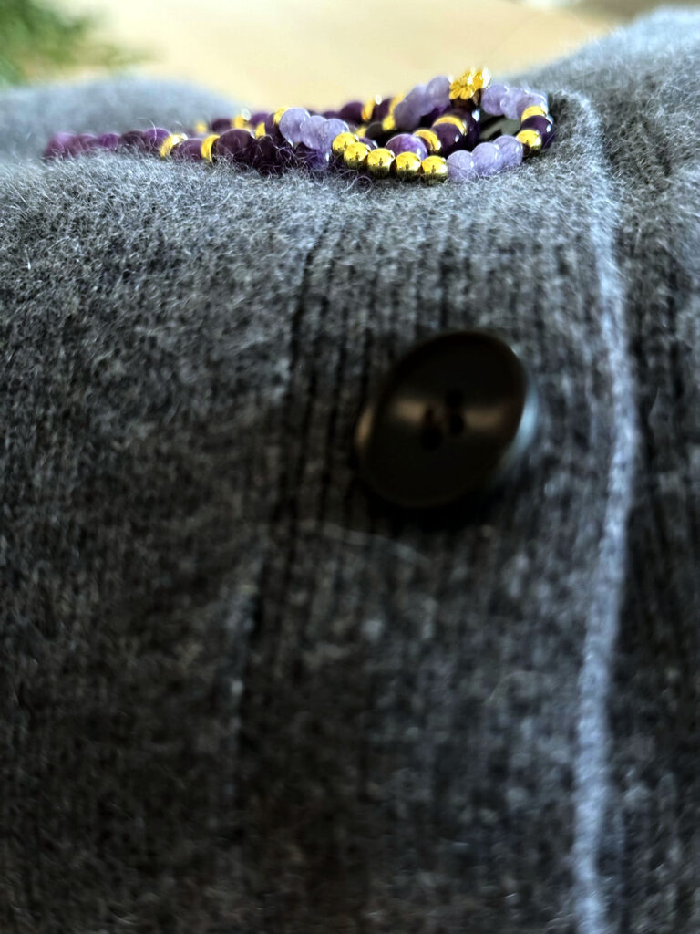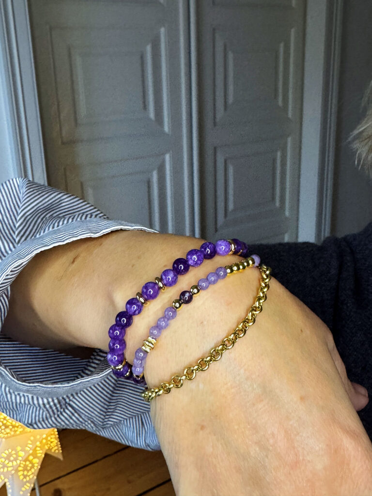 Und meine lila Armbänder: Sind sie nicht wunderschön? Lila und ich haben eine enge Verbindung.