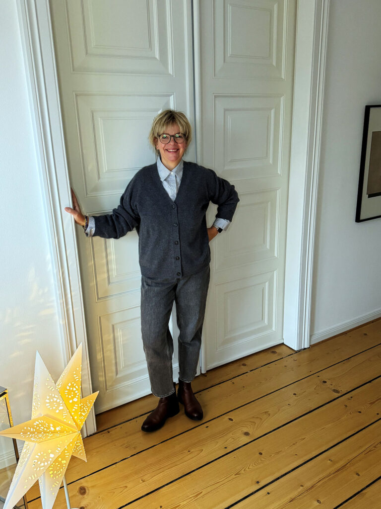 Der Mount Bügelwäsche schaut mich grimmig an und mittags wartet mein Friseur auf mich. Und ähnlich wie das Wetter kann ich auch Grau. Mit einem Hauch Braun. Die Strickjacke ist eine Erinnerung an London und ich werde sie nicht mehr ausziehen. Stand jetzt. Dazu kombiniere ich die Streifenbluse und die Mom Jeans vom Samstag.