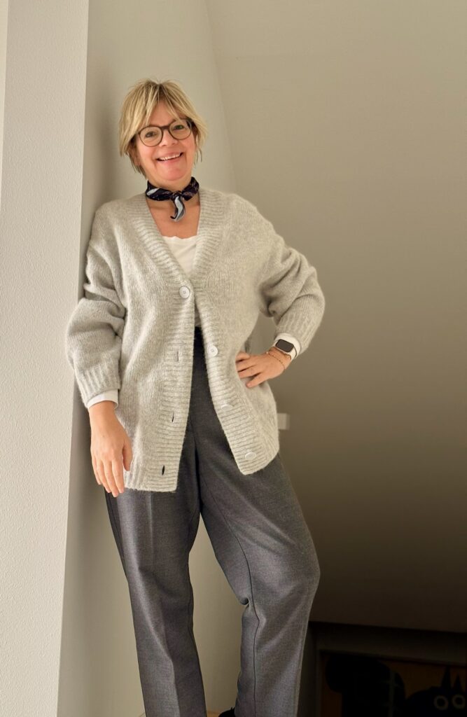 Da ich wegen der Witterung nicht Fahrradfahren mag, darf ich das Auto noch frei räumen. Mein Outfit für diesen Tag? Die graue Anzughose, dazu ein weißes Longsleeve und die (jetzt wieder) topaktuelle Kragenstrickjacke. Um mal wieder eine Farbklammer zu bauen, trage ich dazu die hellen Stiefeletten.