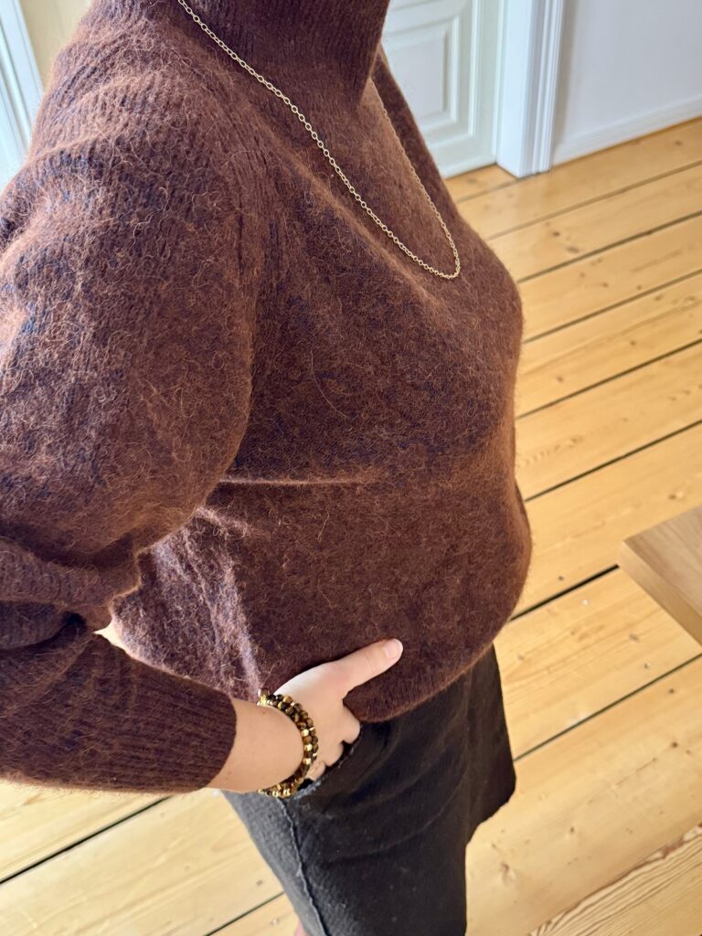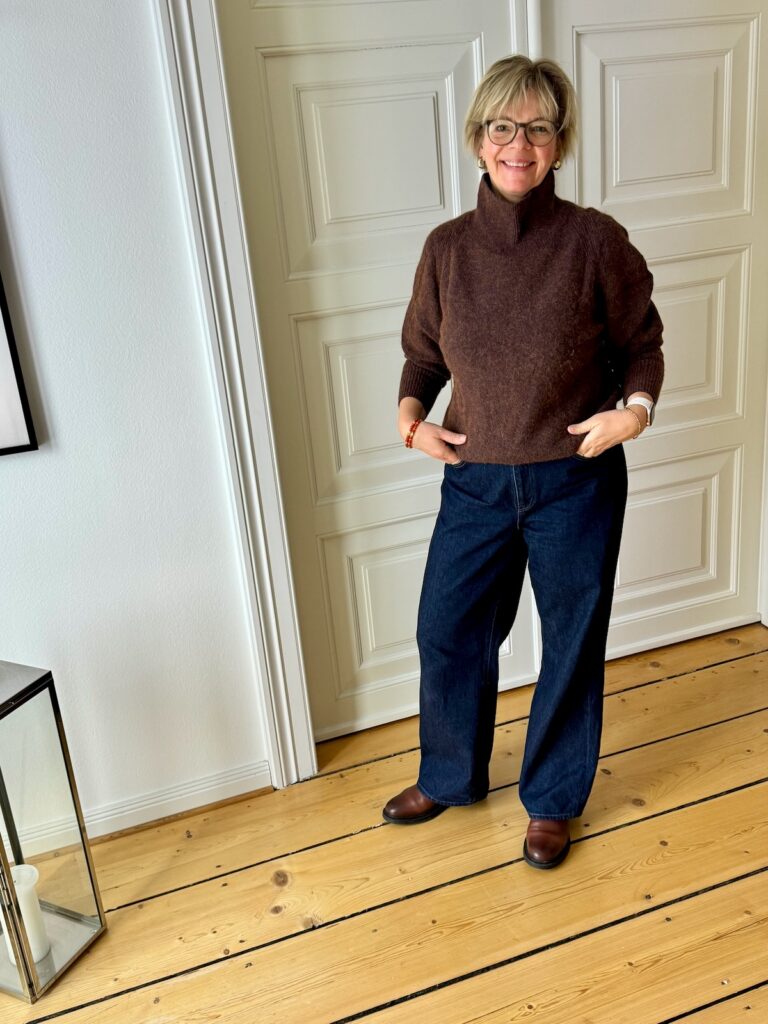 Die weite Jeans vom Samstag, einen kuscheligen, braunen Rollkragenpullover und braune Stiefeletten. Ergänzt wird das Outfit durch die Armbänder von Petra.