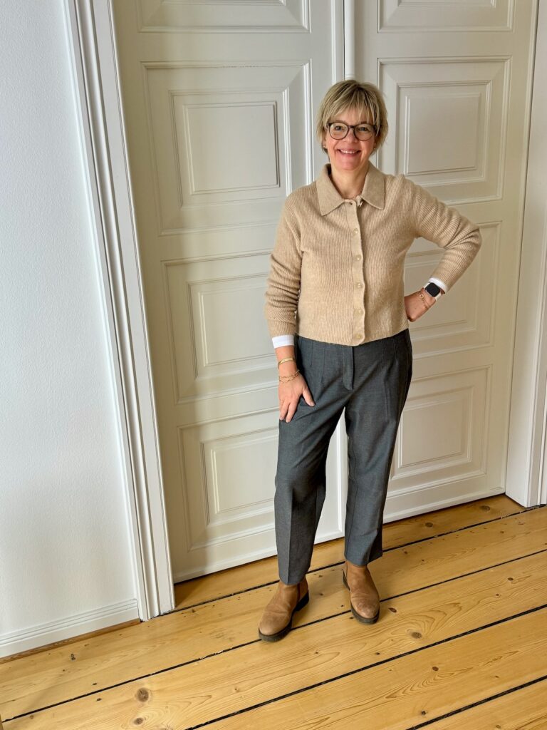 Outfitinspirationen 6. Woche 26-lifewithaglow-graue Anzughose-beige Strickjacke mit Kragen-Stiefeletten in Karamell