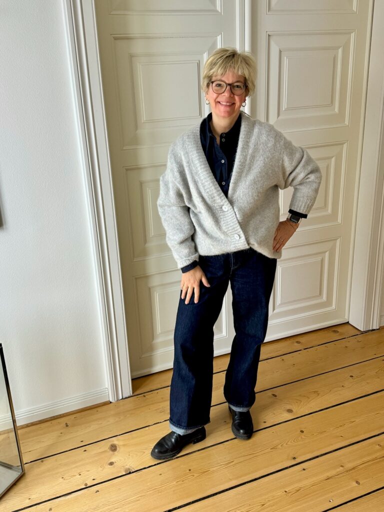 Outfitinspirationen 6. Woche 26-lifewithaglow-dunkelblaue weite Jeans-Cardigan oversized in hellgrau-dunkelblaue Bluse-schwarze Stiefeletten- Armbänder Pera Schmuckmanufaktur