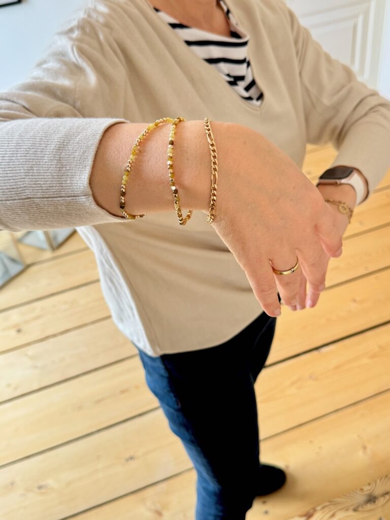 Die Accessoires wähle ich ein bisschen ‚bunter‘, das Oliv des Blazers wiederholt sich wunderbarerweise im Armband. Die Liebhaber und Verfechter der Farbklammer würden es als kleine Farbklammer bezeichnen.
