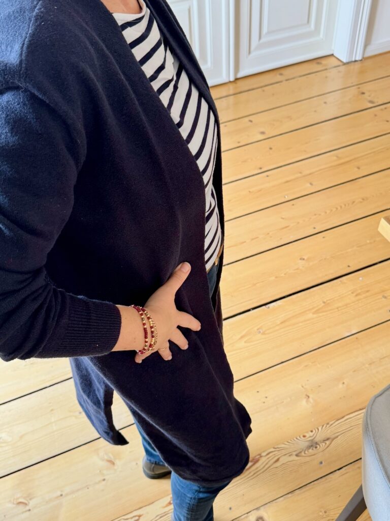 Da die Jeans eng (und es draußen kalt) ist, mag ich es gerne, wenn der Look sich durch die Proportionen verändert. Dazu ist der Cardigan ideal. Um ein bisschen Farbe ins Outfit zu bringen, kombiniere ich dazu die Armbänder von Petra in Bordeaux und einen Gürtel in cognac.